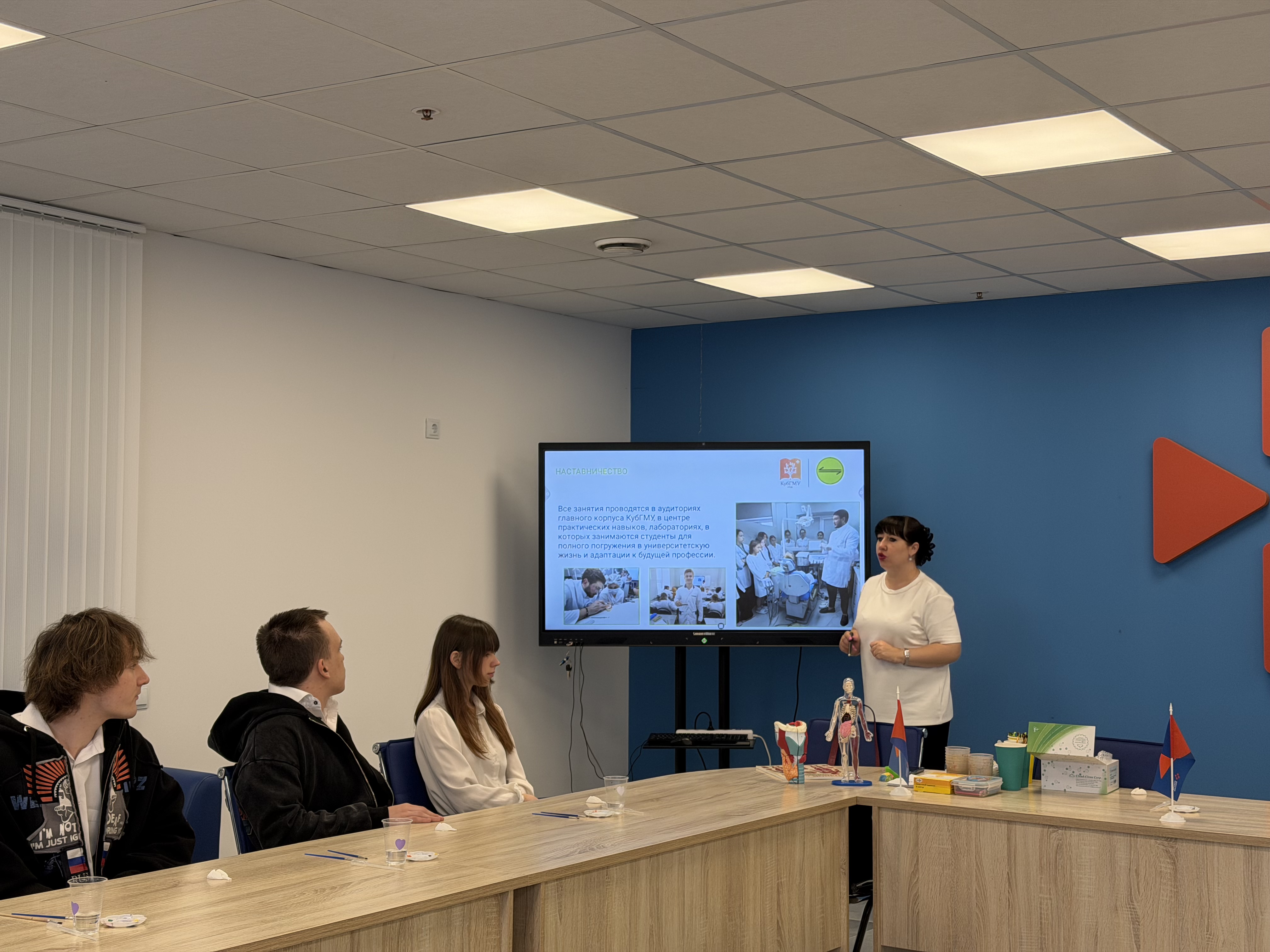 Для участников мероприятия Ольга Балачевская рассказала о КубГМУ, Институте среднего профессионального образования и школе юного доктора «Эквилибриум», а также о возможностях участия школьников в образовательных и профориентационных проектах университета.
