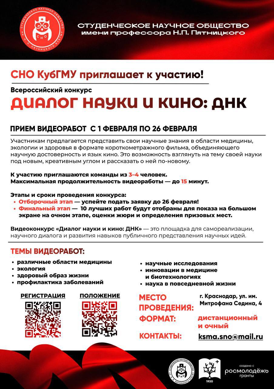 Студенческое научное общество КубГМУ приглашает принять участие во Всероссийском конкурсе научно-популярных видео «Диалог Науки и Кино: ДНК».