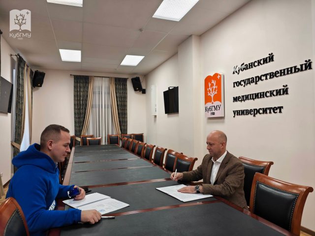 Подписи под соглашением поставили Александр Лагутин, проректор по молодежной политике и воспитательной работе КубГМУ, и Юрий Костомаха, лидер кубанских молодогвардейцев.