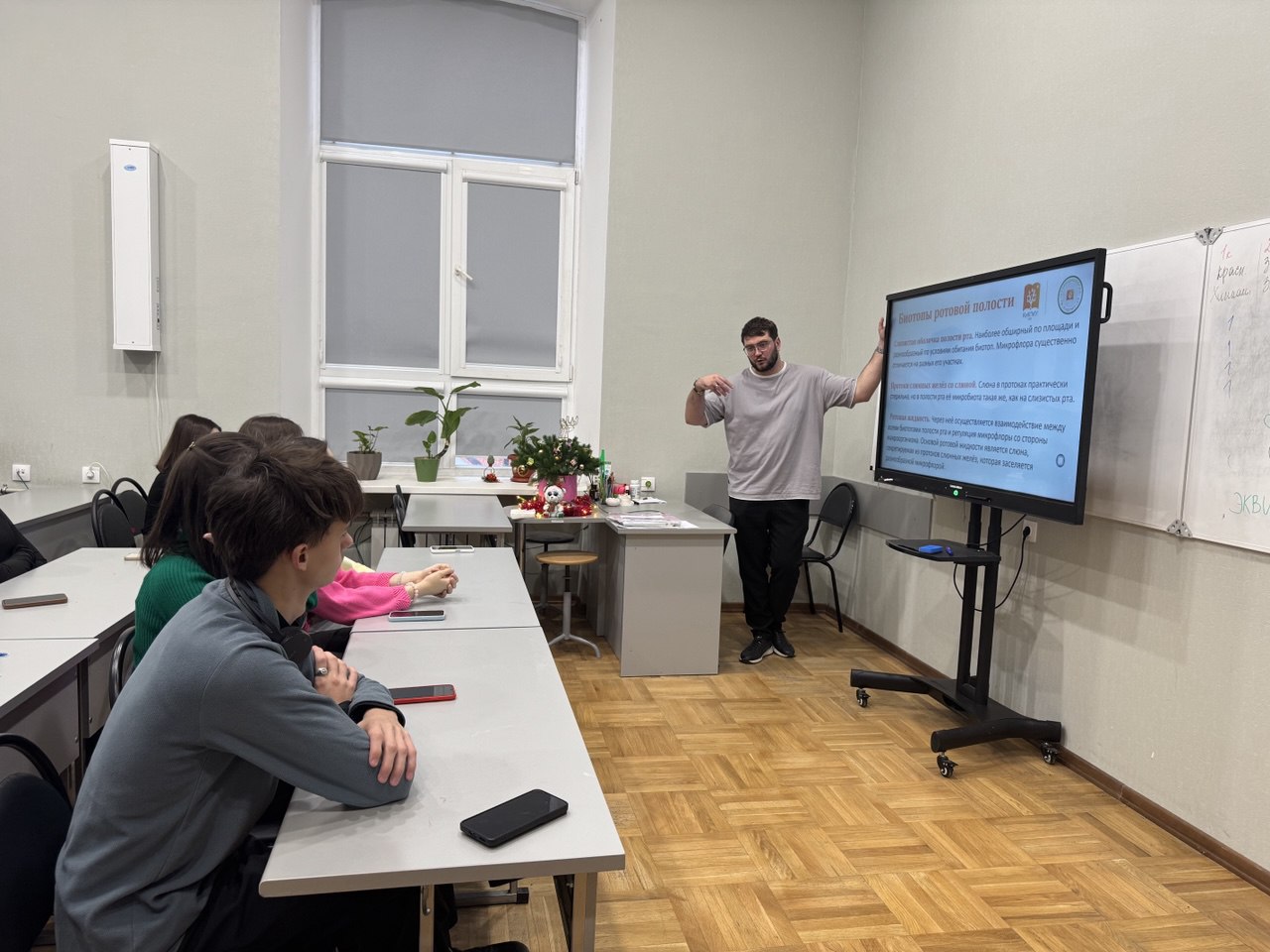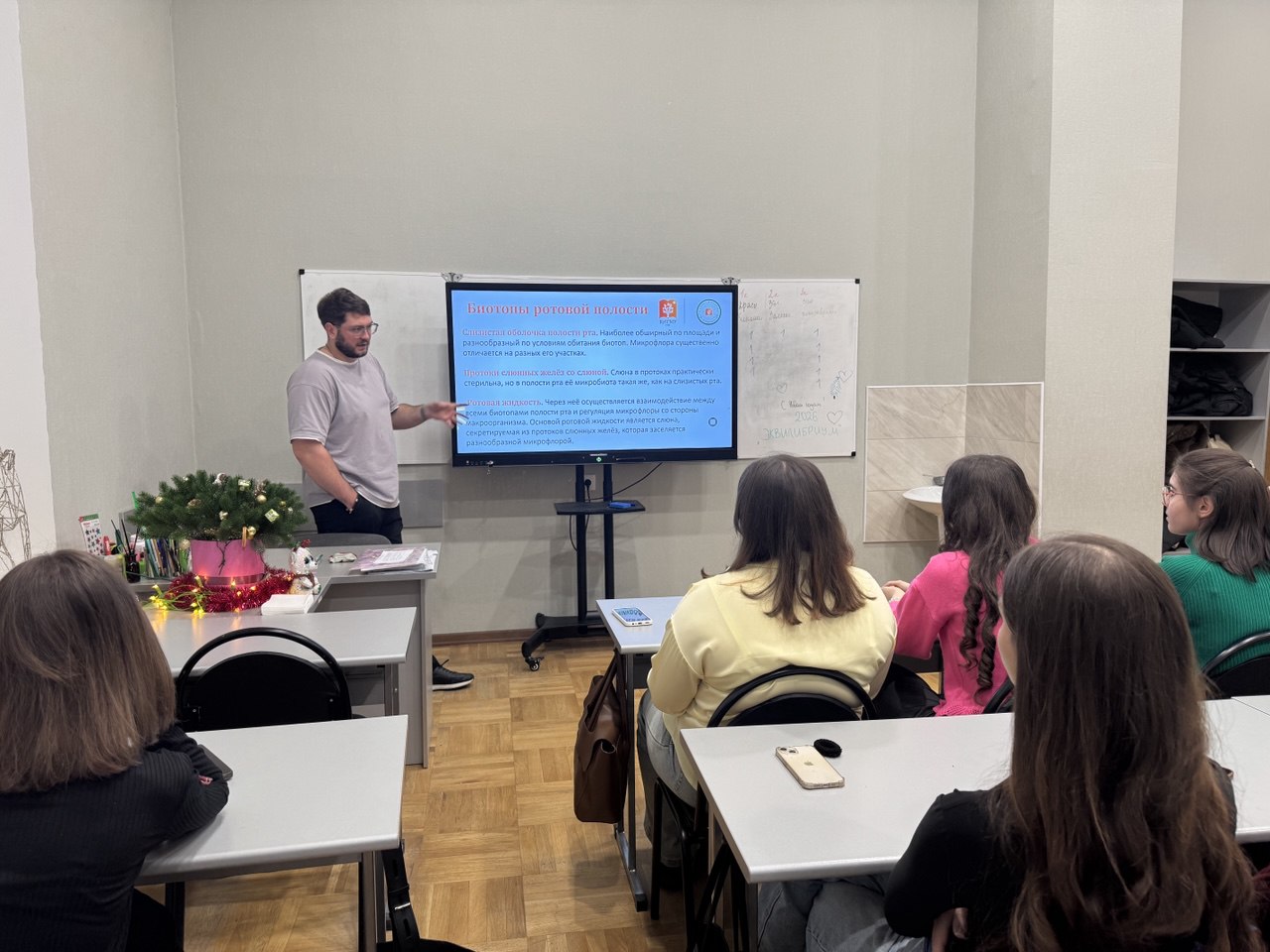 Андрей Милешин провел лекцию по стоматологии, где учащимся продемонстрировал виды зубных налетов, обсудили факторы влияющие на формирование зубной бляшки, разобрали микробиом в ротовой полости человека.