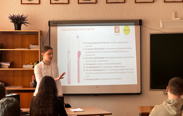 Студентка института стоматологии Ефименко София продемонстрировала правила гигиены полости рта, рассказала о видах зубных щёток и паст, а также об анатомии и физиологии пищеварительной системы.
