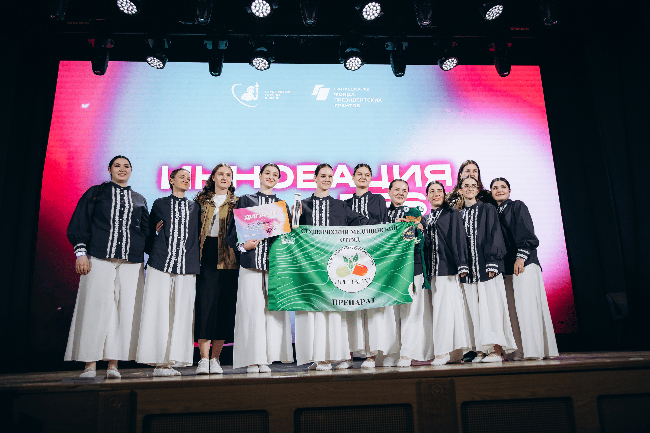 Студенческий медицинский отряд «Препарат» штаба студенческих отрядов КубГМУ достойно представил университет в номинации «Коллективный танец». Выступление команды отличалось яркой подачей, эмоциональностью и слаженностью, что позволило ребятам занять почётное 3 место.