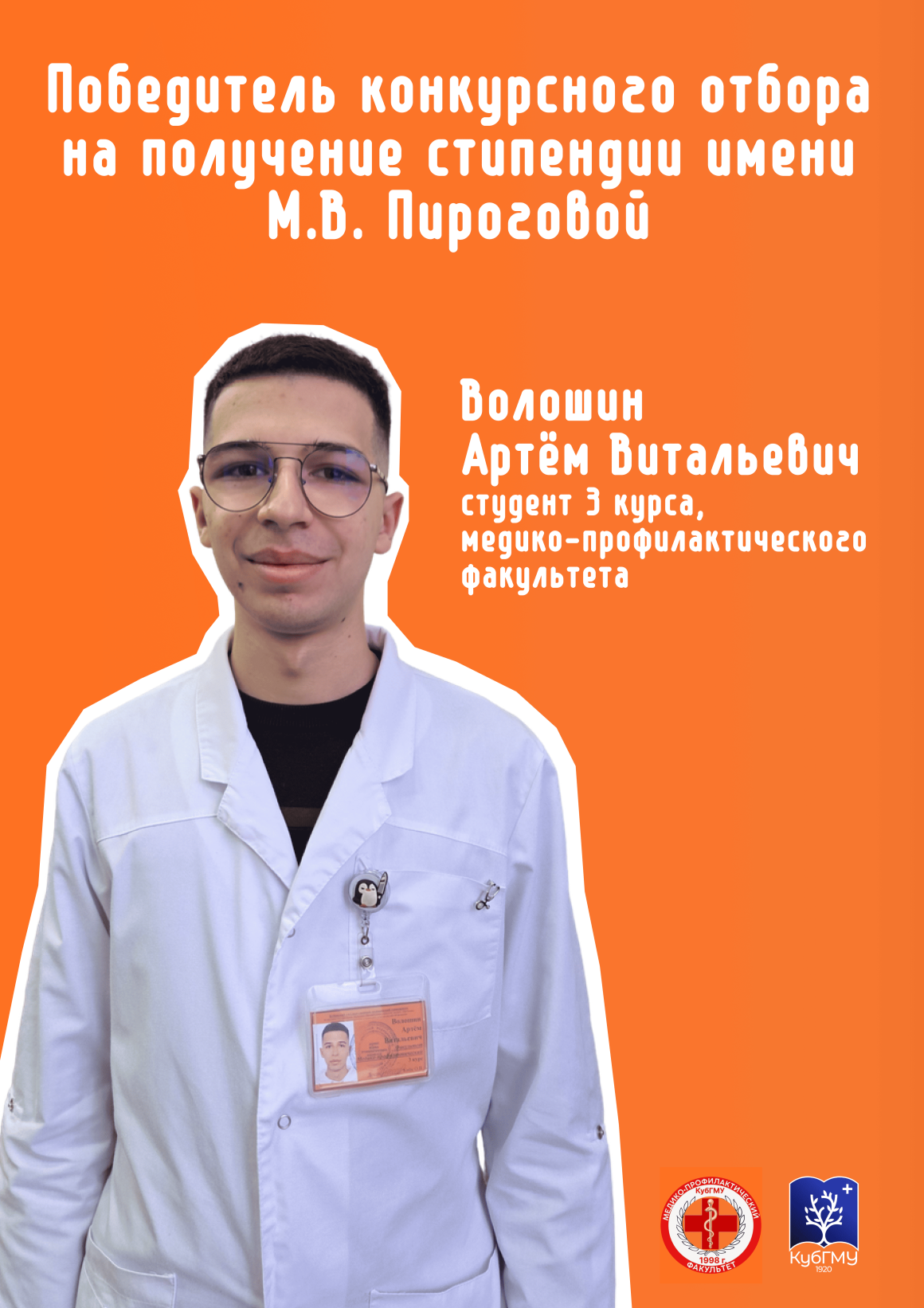 Студент 3 курса медико-профилактического факультета Кубанского государственного медицинского университета Артем Волошин стал одним из десяти победителей со всей России конкурсного отбора на получение федеральной стипендии имени М.В. Пироговой. Программа реализуется Министерством науки и высшего образования Российской Федерации.