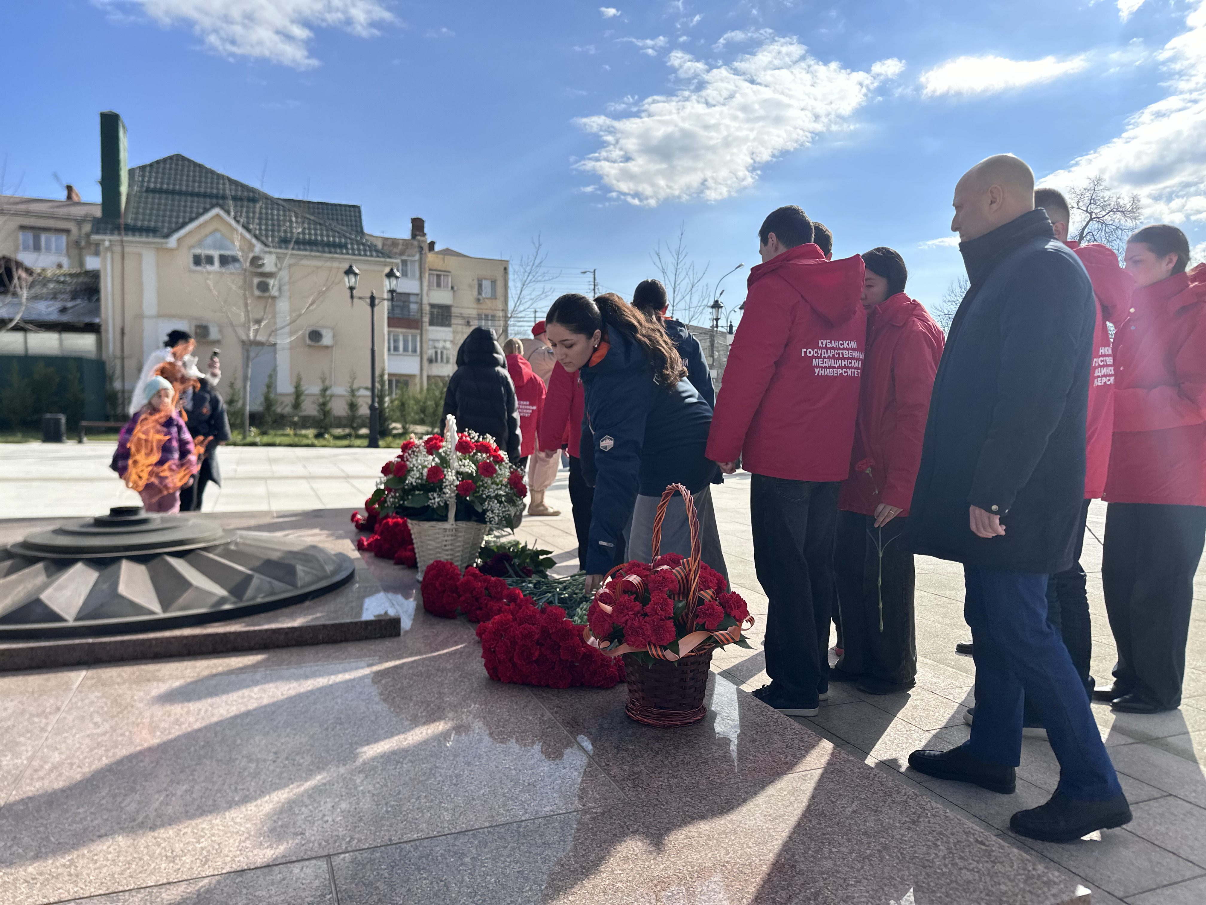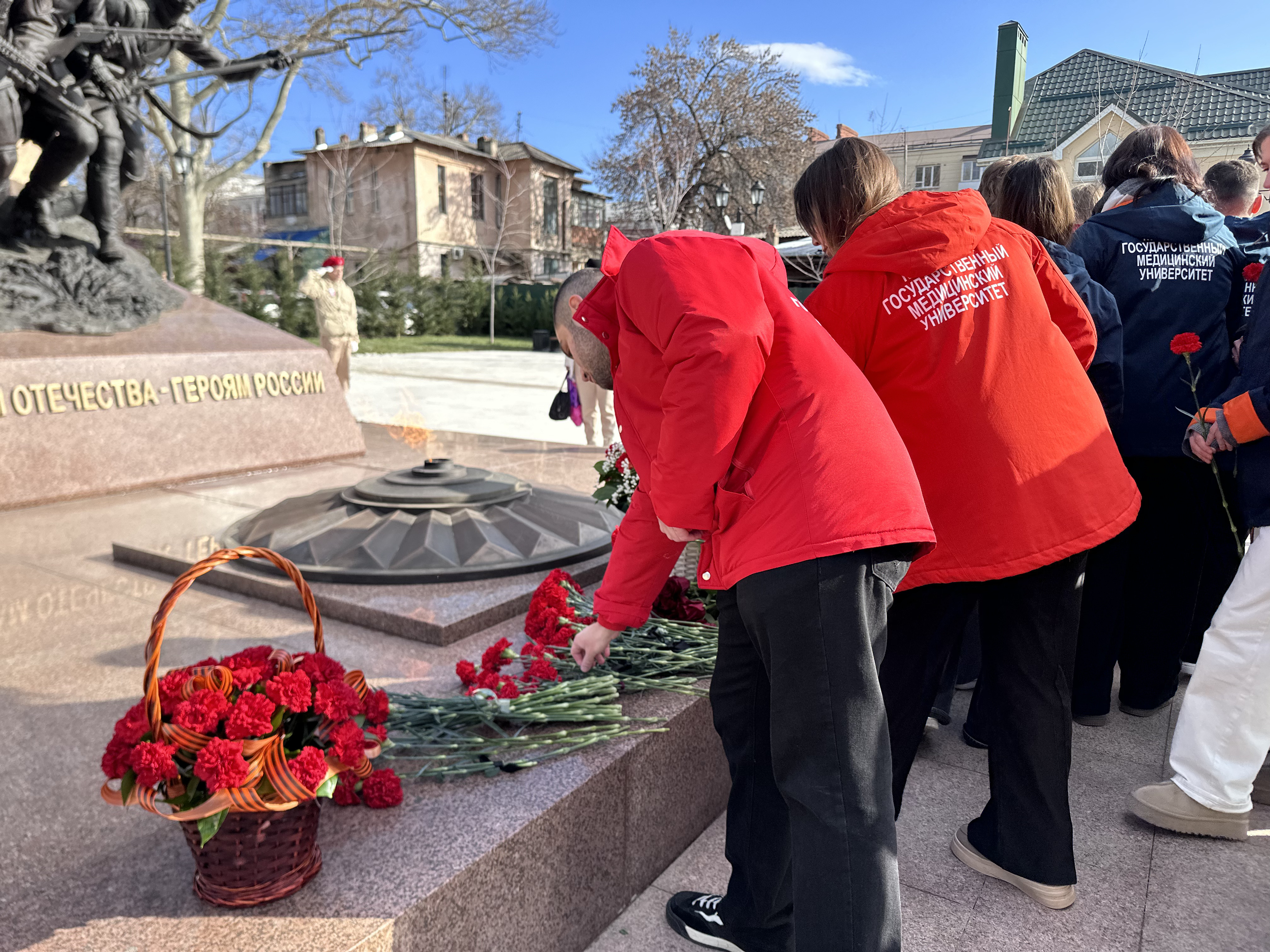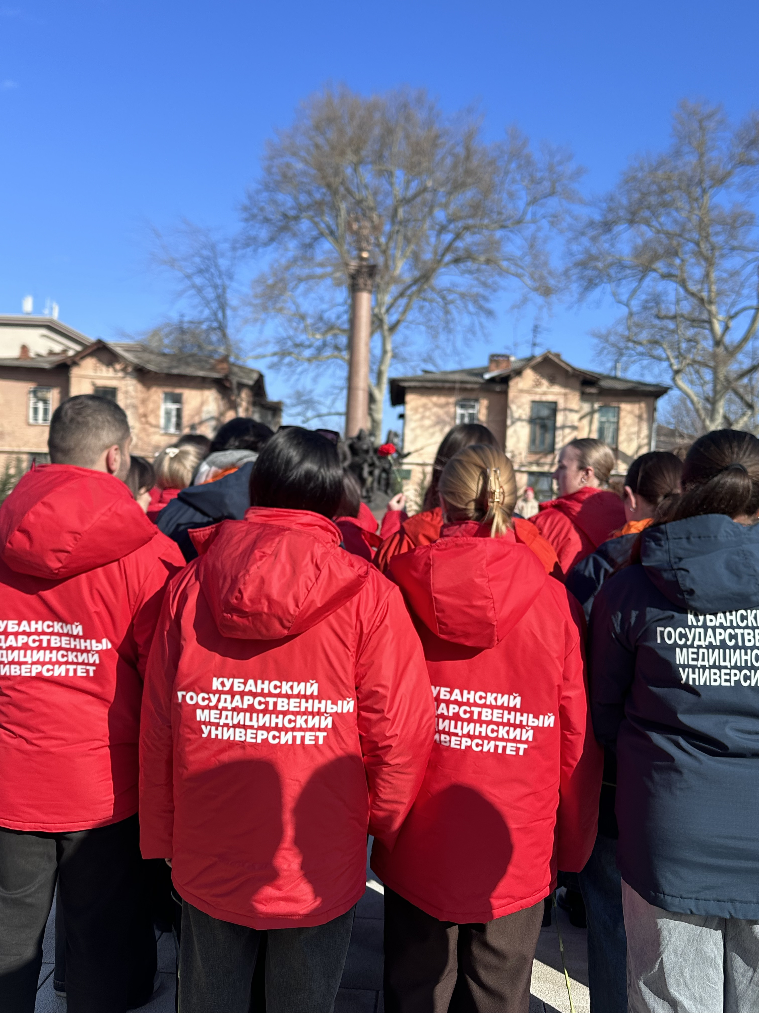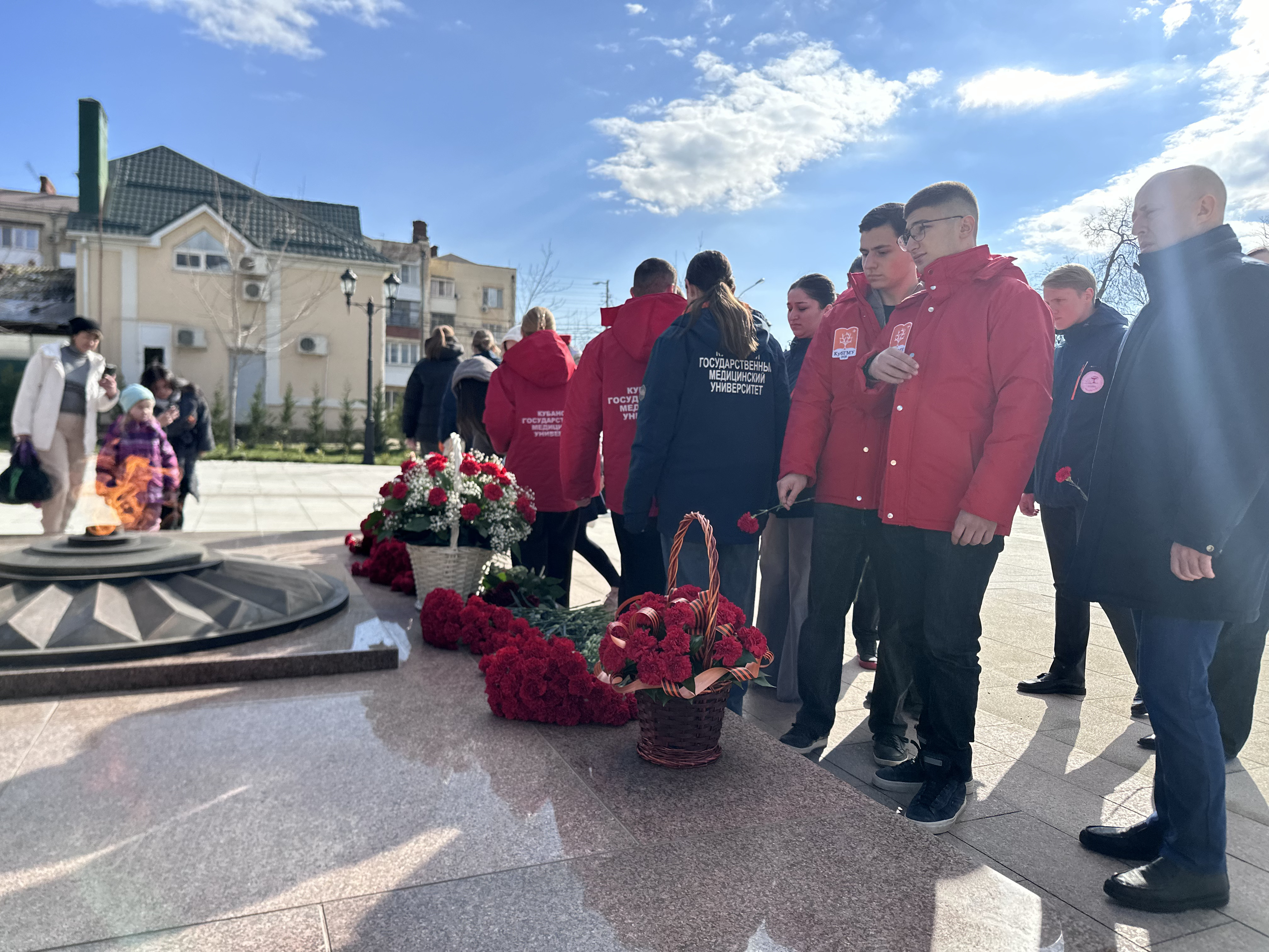 Студенты Кубанского государственного медицинского университета: члены штаба студенческого патриотического клуба МЕДСАНБАТ, активисты Волонтерского центра и Института Наставничества, под руководством проректора по молодежной политике и воспитательной работе Александра Лагутина собрались вместе, чтобы отдать дань памяти тем, кто сражался за свободу и независимость нашего города. Возложили цветы к памятному обелиску, символизирующие благодарность и уважение к подвигам героев.